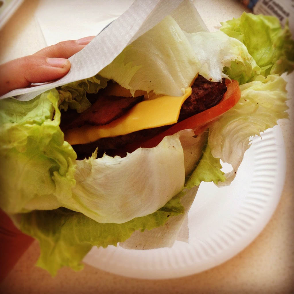 Ibland händer detta: lunch på Max. Dom har en lowcarb-burgare med kött, ost, dressing och grönsaker i salladsblad. Jag la till bacon också. Max-lunch är inget jag förespråkar, men det funkar. Ibland.
