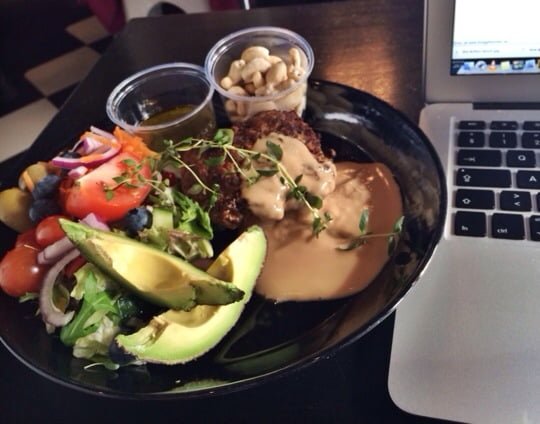 Det finns vissa (många) fördelar med att äta lunch ute, ofta och på samma ställe. När dagens är wallenbergare med potatispuré och massa brunsås får man istället wallenbergare med massa grönsaker, nötter, blåbär, olja och liite brunsås. Utan att ens behöva be om det. LOVE!
