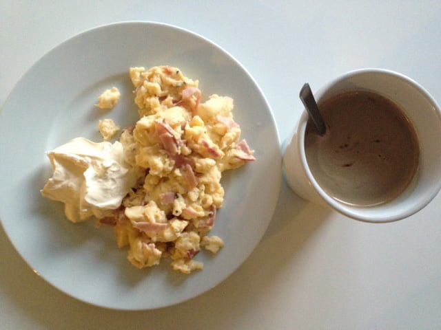 Äggröra med 3 ägg, grädde, ost, skinka och smetana. Gött.