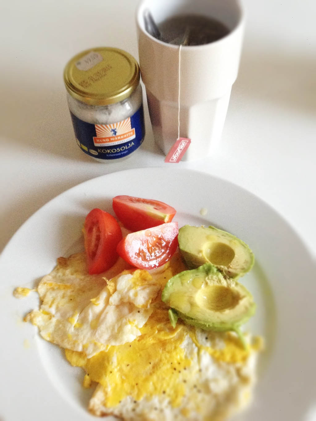Avslutade med stekta ägg, avokado, tomat och Yogi Tea med Markattas kokosolja.