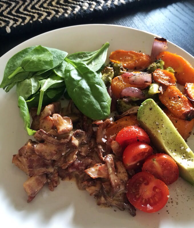 1 stekpanna kantareller, 1 paket bacon, 1 dl grädde och salt och peppar. Tillsammans med ugnsrostade grönsaker, avokado, tomat och spenat. Fantastiskt!
