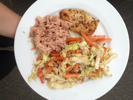 Middag: En mindre lyxig version av Surf n´ turf, Kyckling och tonfisk med vitkål och morötter stekt i kokosolja.