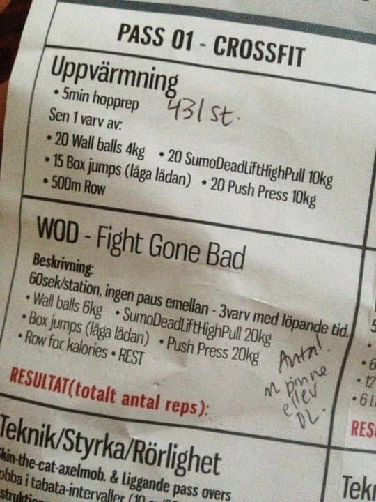 WOD:en lät inte SÅ jobbig, men det var extremt tufft. Jag gick ut rätt hårt, men jag pushade mig själv och ökade antal på varje varv. Väldigt imponerad av mig själv!