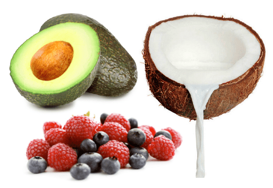 Smoothies på: 1-2dl frusna hallon/blåbär, 1avokado, 1msk lecithin, 1tsk acai pulver, 1msk proteinpulver naturel (antingen kasein/vassle eller ärt/havre) och fyll upp med kokosmjölk/kokosgrädde – mixa med stavmixer. Toppa med Hampafrön, Chiafrön och Kokoschips